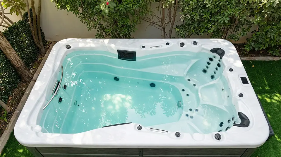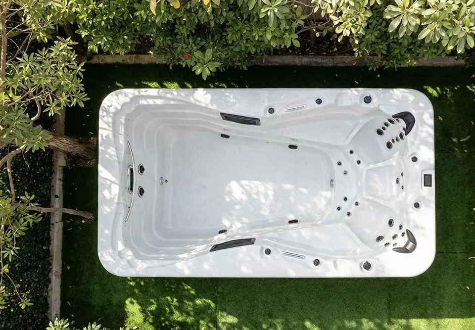 A rectangular white Jacuzzi or swim spa seen from above, set on artificial green grass in a lush garden and surrounded by vibrant plants and trees—perfect for relaxing in your Dubai home.