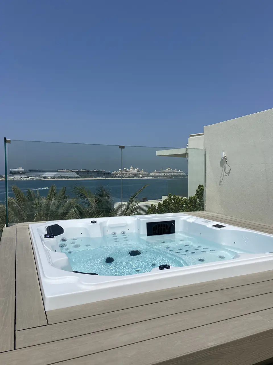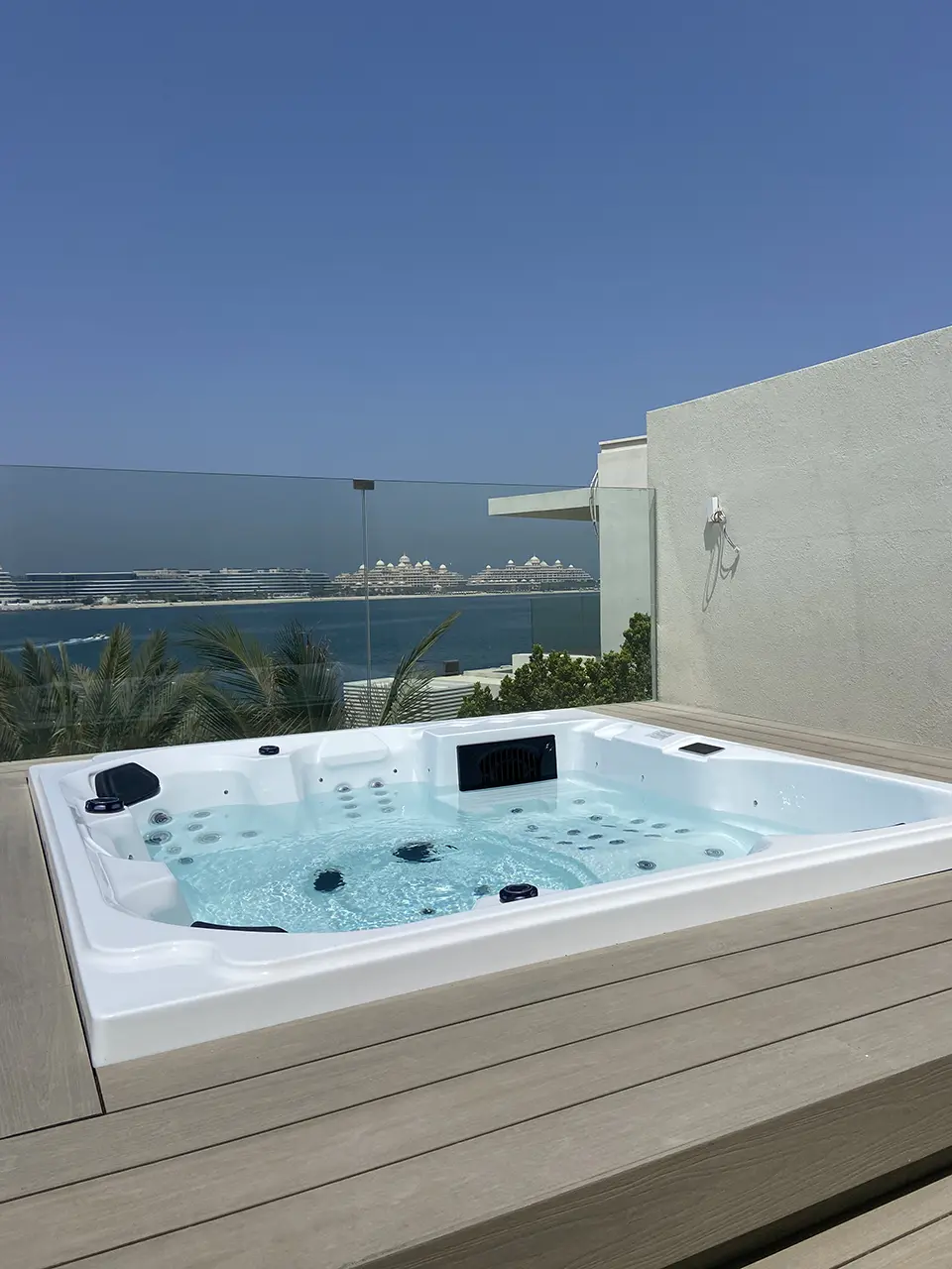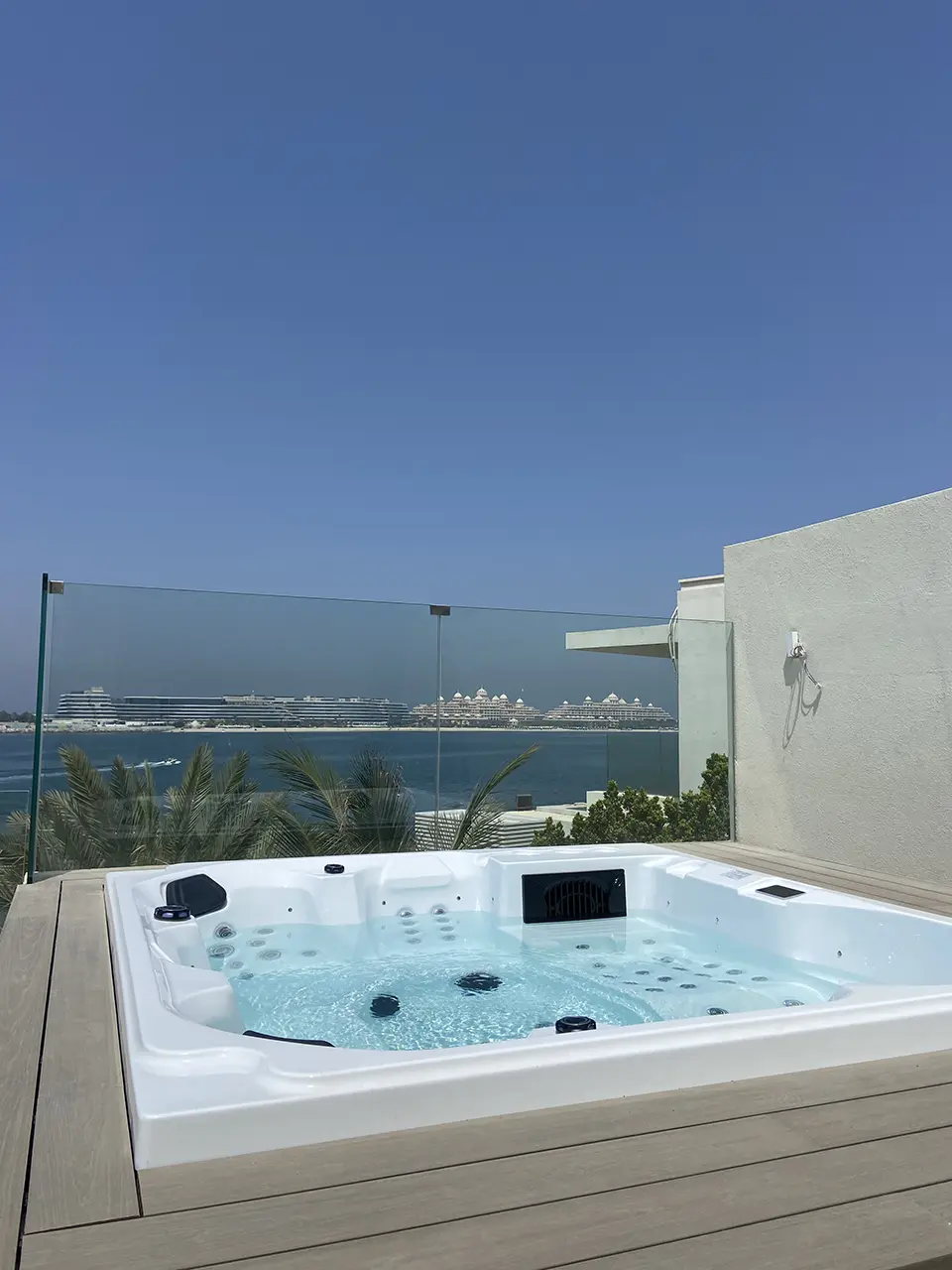 A modern outdoor hot tub filled with clear water sits on a rooftop wooden decking, overlooking palm trees, a body of water, and distant buildings under the clear blue sky of Dubai.