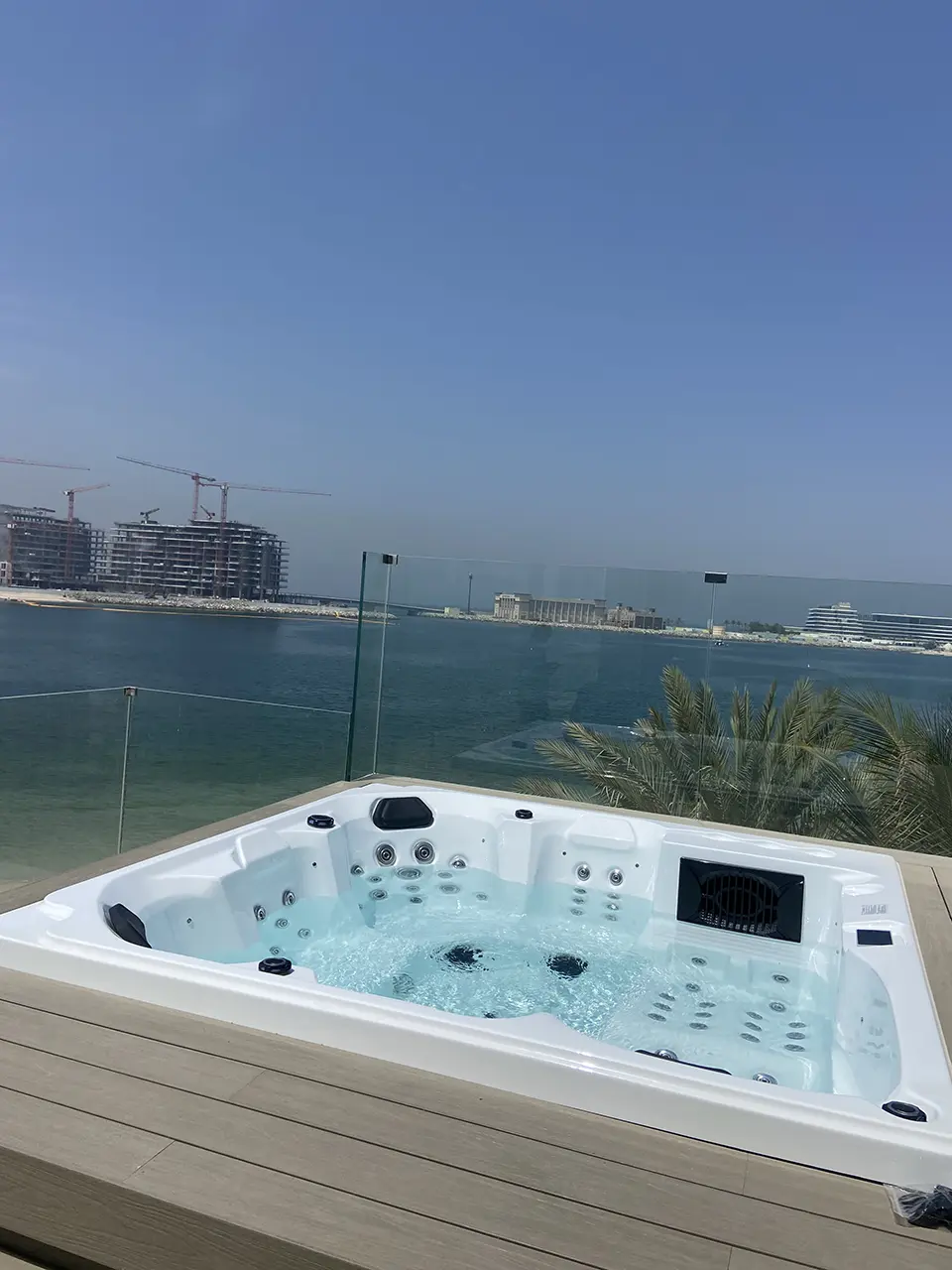 A white outdoor hot tub sits on a wooden rooftop deck overlooking a calm body of water, with palm trees, buildings under construction, and the clear blue sky of the UAE in the background.