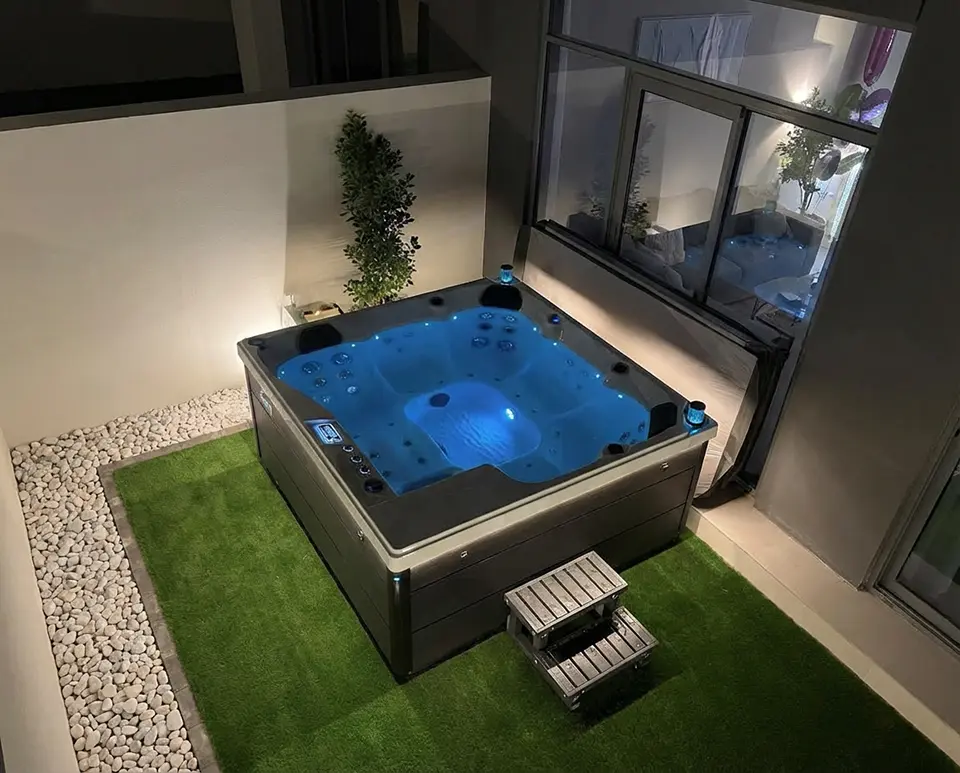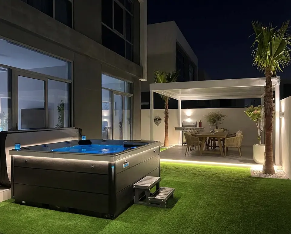 A modern jacuzzi with blue-lit water sits on artificial grass near a building, next to a small set of steps. The well-lit landscape features a plant and large windows, bringing a touch of Dubai-inspired luxury to the scene.