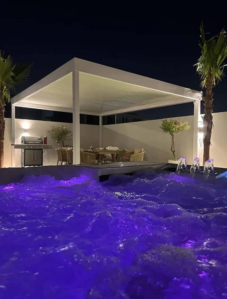 A pergola with a dining area and barbecue grill is illuminated at night, viewed from a bubbling jacuzzi with purple lights. Palm trees and potted plants decorate the modern garden outdoor space.