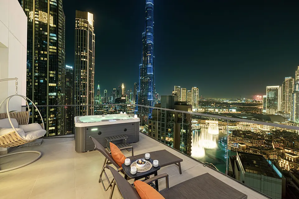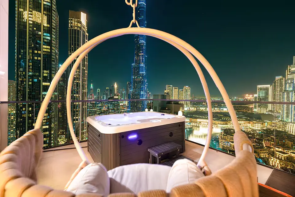 Night-time cityscape from a balcony flat rental with a hot tub, hanging chair, and snack table. Skyscrapers—including the illuminated Burj Khalifa—and a vibrant fountain show create a stunning backdrop.