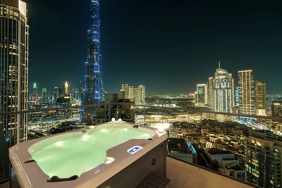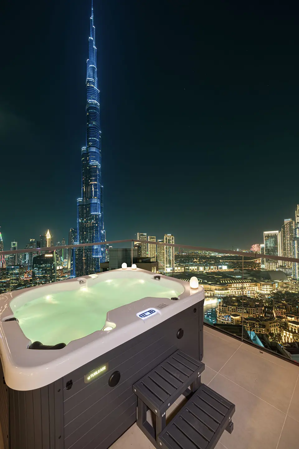A rooftop rental hot tub with glowing water overlooks the illuminated Dubai skyline at night, featuring the tall Burj Khalifa and surrounding skyscrapers.