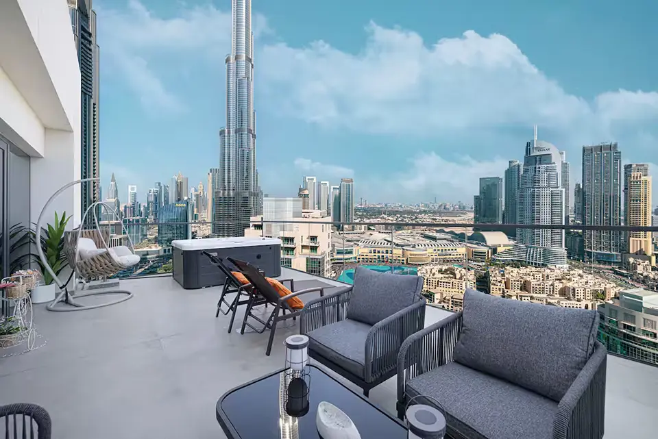 A modern flat balcony with cosy seating, a swing chair, and a hot tub overlooks a cityscape of tall skyscrapers and the iconic Burj Khalifa under a blue sky with scattered clouds.