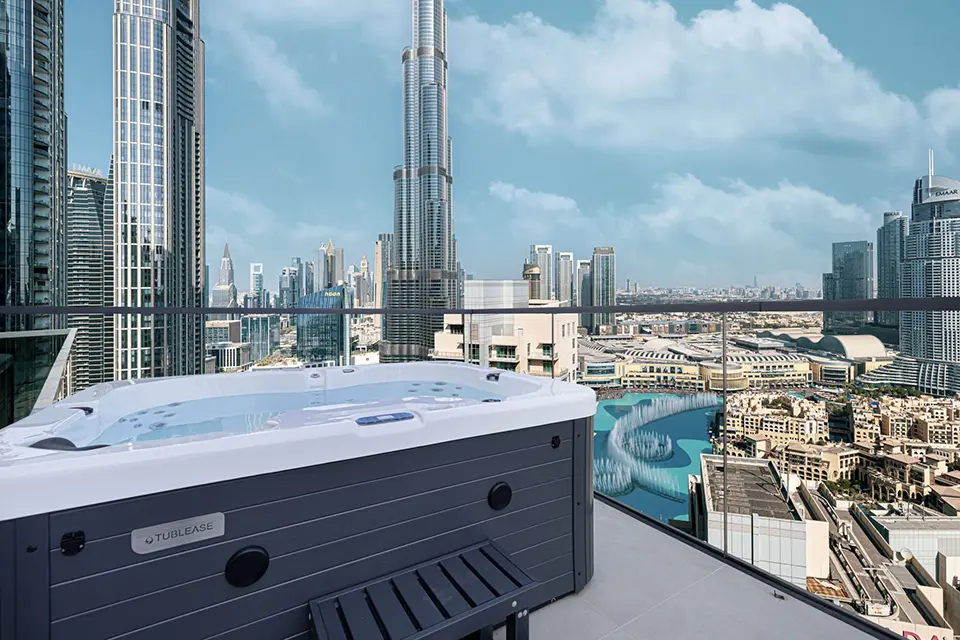 A rooftop jacuzzi hire overlooks the city skyline, with tall modern skyscrapers and the Burj Khalifa in the background under a blue sky with scattered clouds.